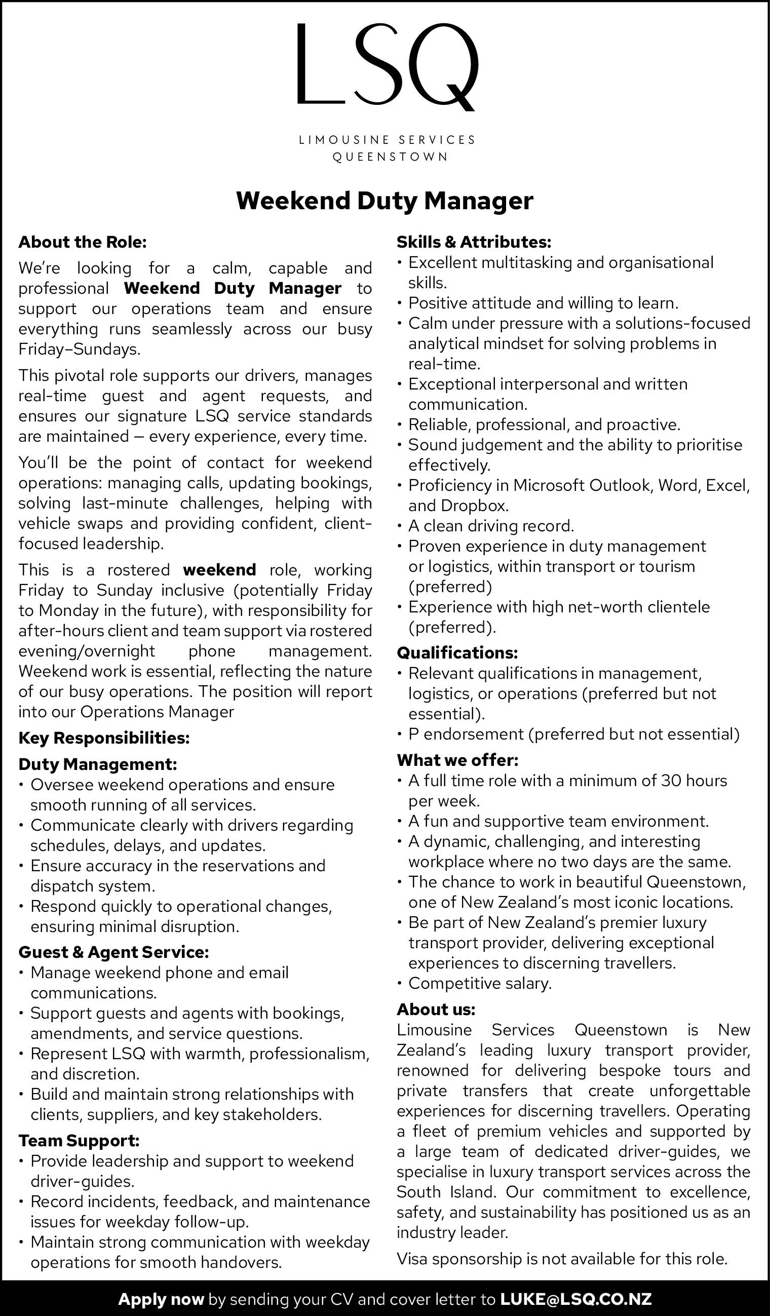 We’re looking for a calm, capable and professional Weekend Duty Manager to support our operations team and ensure everything runs seamlessly across our busy Friday–Sundays.