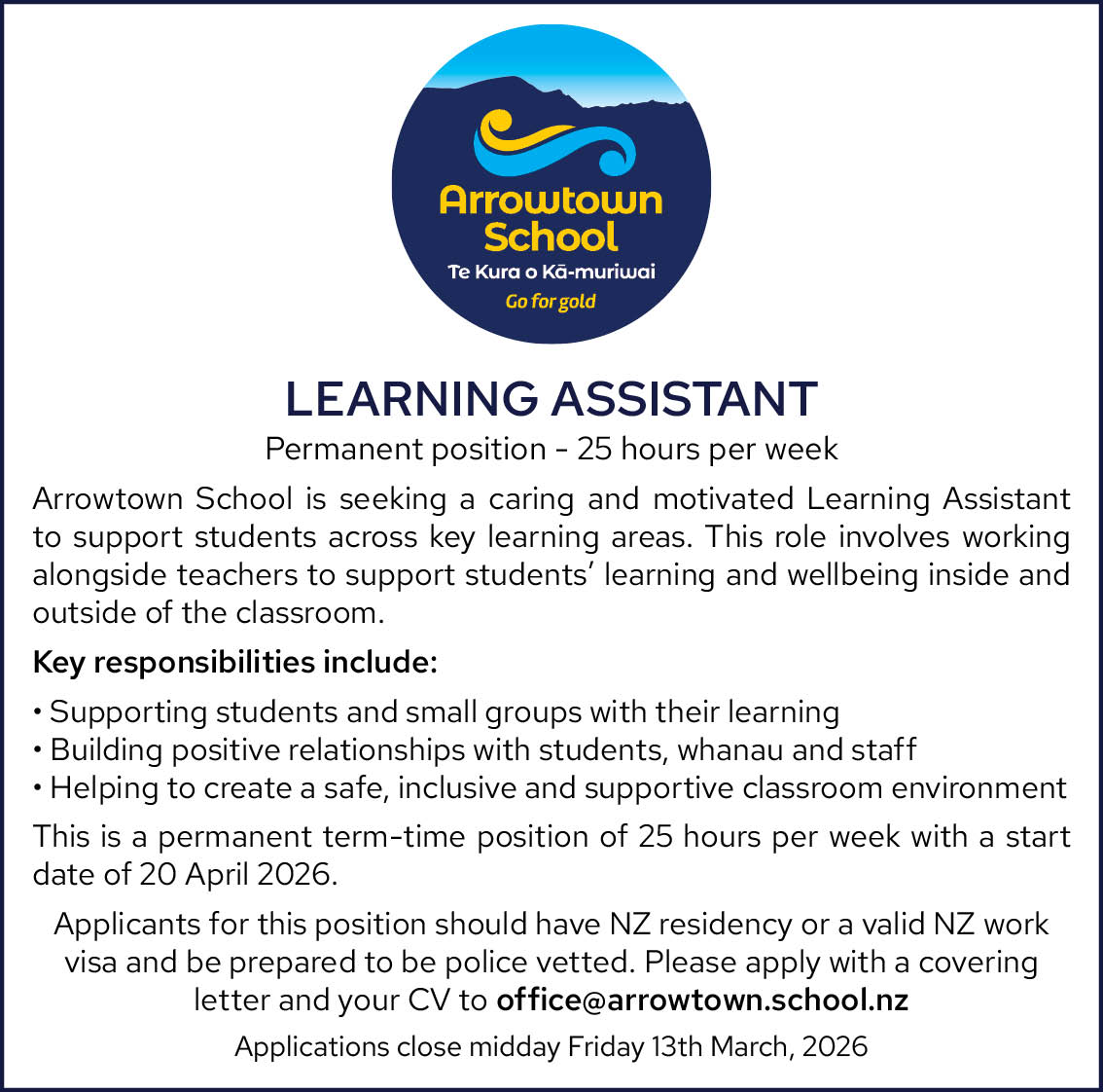Arrowtown School is seeking a caring and motivated Learning Assistant to support students across key learning areas.