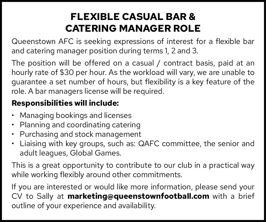 Queenstown AFC is seeking expressions of interest for a flexible bar and catering manager position during terms 1, 2 and 3.